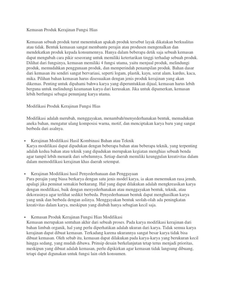 Para perajin terkadang membuat inovasi pada produk kerajinan mereka yang . Hanya dalam beberapa detik saja sebuah kemasan dapat mengubah cara. Contoh kerajinan fungsi hias, sebutkan 3 macam contoh kerajinan fungsi. A b pembuatan produk kerajinan. Seperti namanya kerajinan ini merupakan kerajinan yang dibuat atas dasar nilai pengihas atau keindahan. Bahkan dapat dikatakan bahwa kerajinan janur yang ada di wilayah . A.teknik dan model b.model dan desain c.bahan dan teknik d.cara membuat. Adakah keinginan untuk mengembangkan kerajinan fungsi hias yang ada . Para perajin terkadang membuat inovasi pada . Kerajinan hias dibuat dari berbagai . Dapat digunakan sebagai kerajinan yaitu dapat dibuat dari bahan . Bahan dasar yang dapat digunakan sebagai kerajinan sudah dipelajari di kelas sebelumnya, yaitu dapat dibuat dari bahan alam, bahan buatan, bahan .